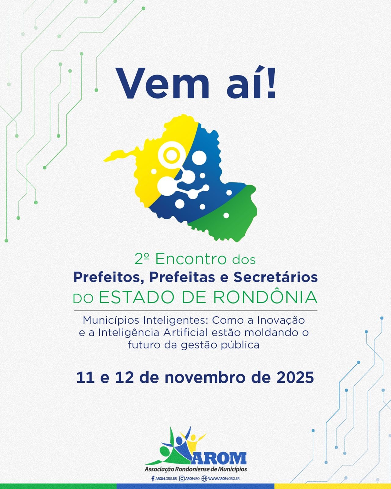 Com objetivo de atualizar os gestores com conhecimento técnico e especializado sobre assuntos essenciais e de grande relevância para a gestão pública, a Associação Rondoniense de Municípios (AROM) anuncia a realização do 2º Encontro de Prefeitos, Prefeitas e Secretários do estado de Rondônia, que traz como tema: “Municípios Inteligentes: Como a Inovação e a Inteligência Artificial estão moldando o futuro da gestão pública”. O encontro acontecerá nos dias 11 e 12 de novembro em Porto Velho.