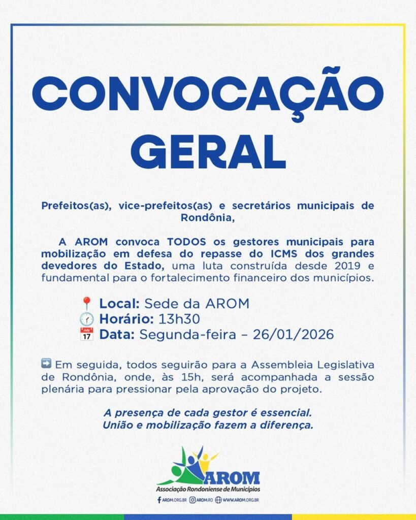 A Associação Rondoniense de Municípios (AROM) convoca prefeitos, prefeitas, vereadores(as) e gestores municipais de todo o estado para uma mobilização conjunta nesta segunda-feira, 26 de janeiro de 2026, com o objetivo de pressionar a Assembleia Legislativa de Rondônia (ALE/RO) a pautar e votar o projeto de Transação Tributária, considerado estratégico para a recuperação de receitas municipais.